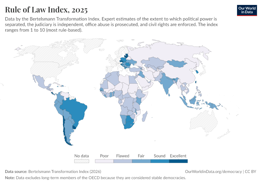 Bertelsmann Transformation Index (2024) – processed by Our World in Data. “Rule of Law Index” [dataset]. Bertelsmann Transformation Index, “Bertelsmann Transformation Index, Scores” [original data]. Retrieved January 6, 2026 from https://sophia-test-2.owid.pages.dev/grapher/rule-of-law-index-bti