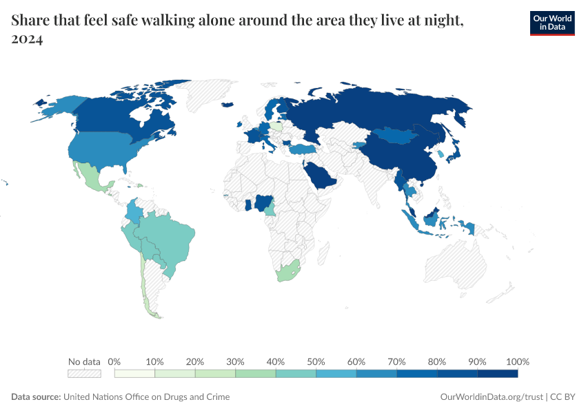 “Data Page: Share that feel safe walking alone around the area they live at night”. Our World in Data (2026). Data adapted from United Nations Office on Drugs and Crime. Retrieved from https://sophia-test-2.owid.pages.dev/grapher/safety-walking-alone [online resource]How to cite this data