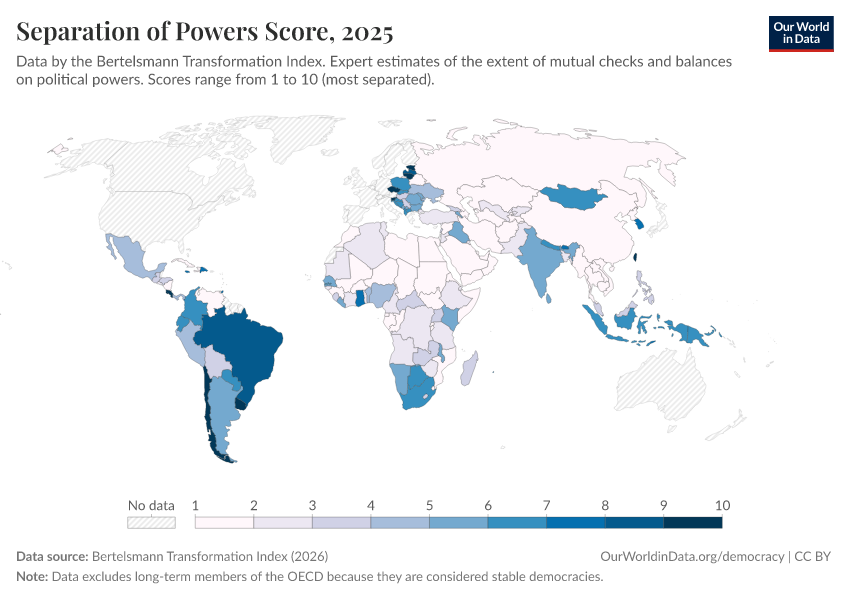 “Data Page: Separation of powers score”, part of the following publication: Bastian Herre, Lucas Rodés-Guirao, and Esteban Ortiz-Ospina (2013) - “Democracy”. Data adapted from Bertelsmann Transformation Index. Retrieved from https://sophia-test-2.owid.pages.dev/grapher/separation-of-powers-score-bti [online resource]How to cite this data