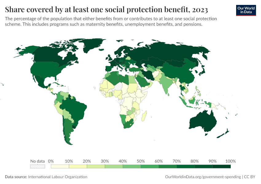 International Labour Organization – with minor processing by Our World in Data. “Share covered by at least one social protection benefit” [dataset]. International Labour Organization, “ILO modelled estimates 2024, ILO estimates based on national sources” [original data]. Retrieved January 6, 2026 from https://sophia-test-2.owid.pages.dev/grapher/share-covered-by-one-social-protection-benefit