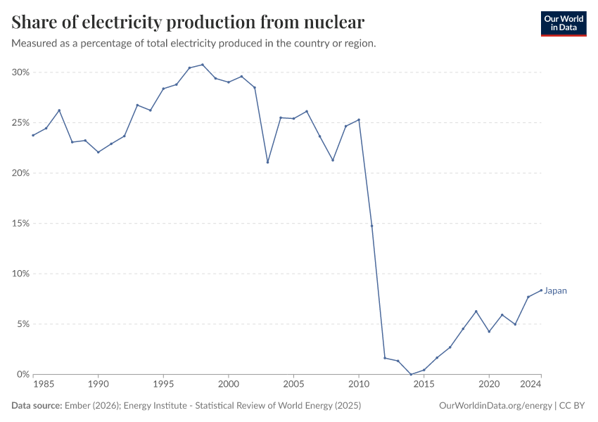 Ember (2025); Energy Institute - Statistical Review of World Energy (2025) – with major processing by Our World in Data. “Share of electricity generated by nuclear power” [dataset]. Ember, “Yearly Electricity Data Europe”; Ember, “Yearly Electricity Data”; Energy Institute, “Statistical Review of World Energy” [original data]. Retrieved January 6, 2026 from https://sophia-test-2.owid.pages.dev/grapher/share-electricity-nuclear