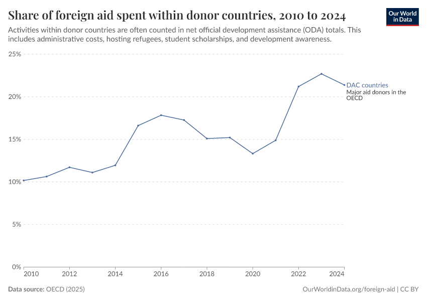 OECD (2025) – with minor processing by Our World in Data. “Share of foreign aid spent within donor countries – Net disbursements” [dataset]. OECD, “OECD Official Development Assistance (ODA) - DAC1: Flows by provider (ODA+OOF+Private)” [original data]. Retrieved January 6, 2026 from https://sophia-test-2.owid.pages.dev/grapher/share-of-foreign-aid-spent-within-donor-countries