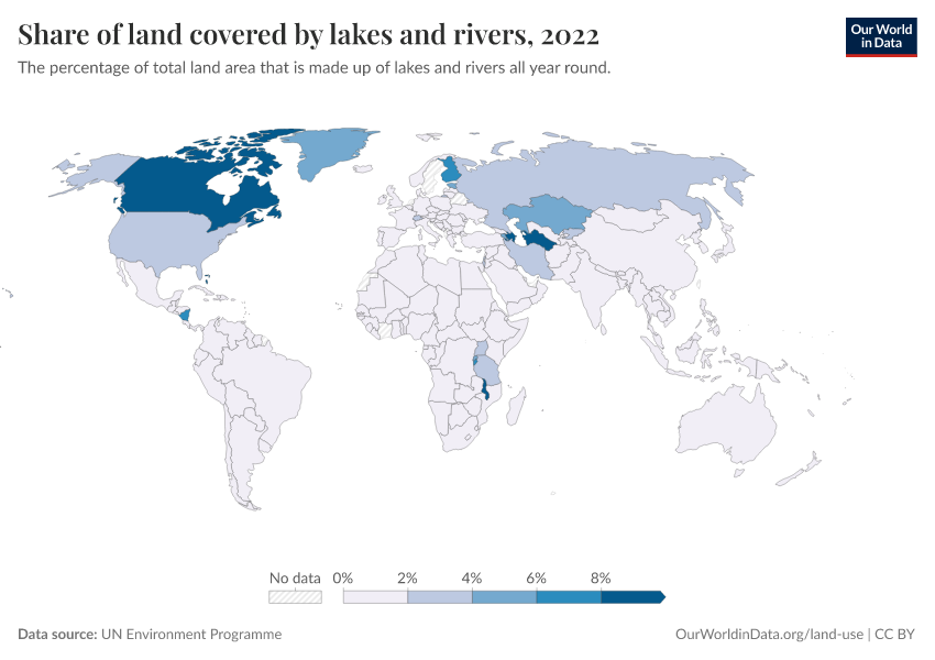 “Data Page: Share of land covered by lakes and rivers”. Our World in Data (2026). Data adapted from UN Environment Programme. Retrieved from https://sophia-test-2.owid.pages.dev/grapher/share-of-land-covered-by-lakes-and-rivers [online resource]How to cite this data