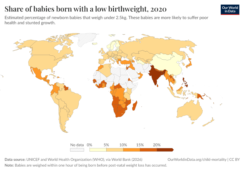 “Data Page: Share of babies born with a low birthweight”. Our World in Data (2026). Data adapted from UNICEF and World Health Organization (WHO), via World Bank. Retrieved from https://sophia-test-2.owid.pages.dev/grapher/share-of-low-birthweight-babies-born [online resource]How to cite this data