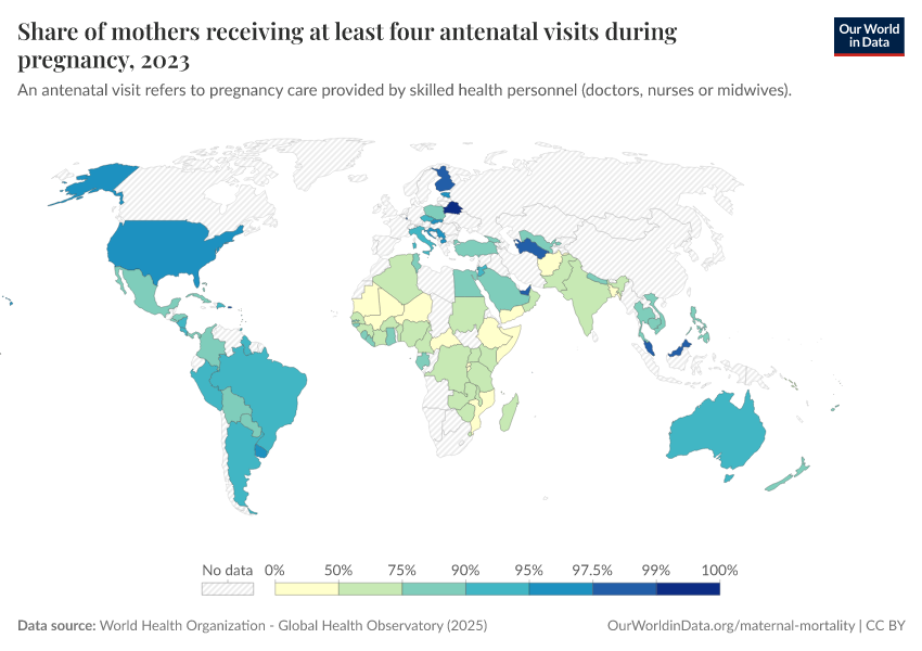 “Data Page: Share of mothers receiving at least four antenatal visits during pregnancy”. Our World in Data (2026). Data adapted from World Health Organization. Retrieved from https://sophia-test-2.owid.pages.dev/grapher/share-of-mothers-receiving-at-least-four-antenatal-visits-during-pregnancy [online resource]How to cite this data
