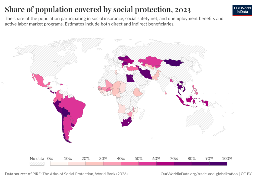 “Data Page: Share of population covered by social protection”. Our World in Data (2026). Data adapted from ASPIRE: The Atlas of Social Protection, World Bank. Retrieved from https://sophia-test-2.owid.pages.dev/grapher/share-of-population-covered-by-social-protection [online resource]How to cite this data
