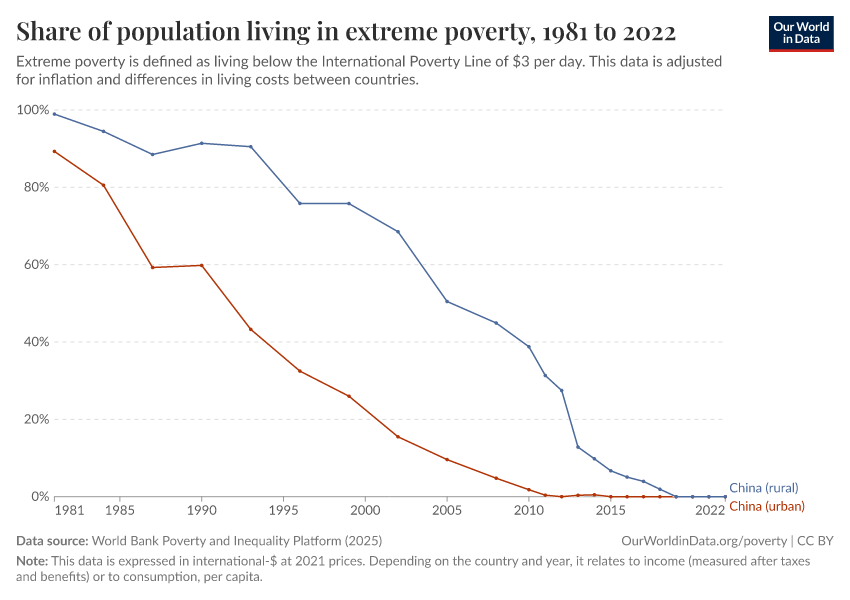 World Bank Poverty and Inequality Platform (2025) – with major processing by Our World in Data. “Share of population living in extreme poverty – World Bank” [dataset]. World Bank Poverty and Inequality Platform, “World Bank Poverty and Inequality Platform (PIP) 20250930_2021, 20250930_2017” [original data]. Retrieved January 6, 2026 from https://sophia-test-2.owid.pages.dev/grapher/share-of-population-in-extreme-poverty
