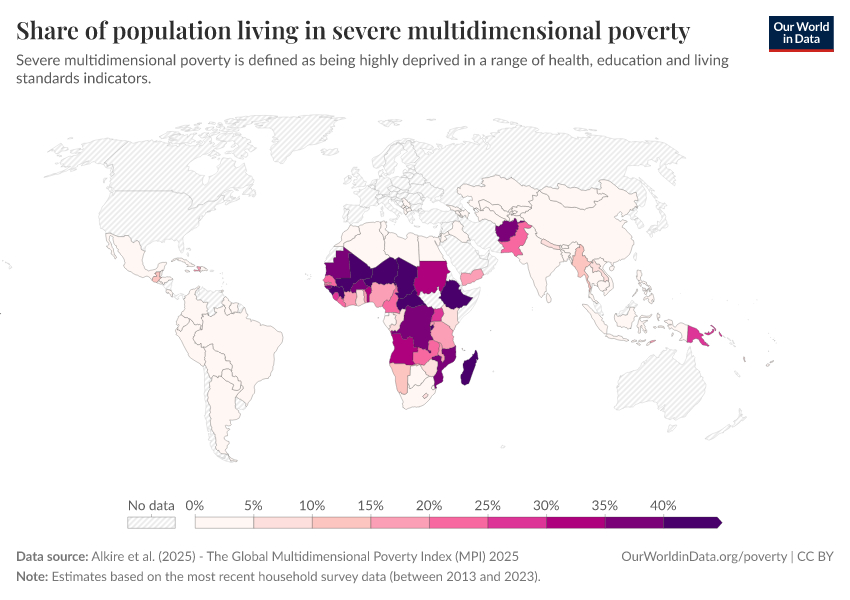 Alkire et al. (2025) - The Global Multidimensional Poverty Index (MPI) 2025 – with minor processing by Our World in Data. “Share of population living in severe multidimensional poverty – Most recent year” [dataset]. Alkire et al., “Global Multidimensional Poverty Index (MPI) 2025” [original data]. Retrieved January 6, 2026 from https://sophia-test-2.owid.pages.dev/grapher/share-of-population-in-severe-multidimensional-poverty