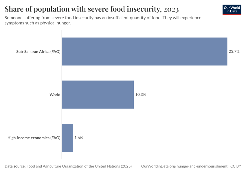 “Data Page: Prevalence of severe food insecurity in the total population”, part of the following publication: Hannah Ritchie, Pablo Rosado, and Max Roser (2023) - “Agricultural Production”. Data adapted from Food and Agriculture Organization of the United Nations. Retrieved from https://sophia-test-2.owid.pages.dev/grapher/share-of-population-with-severe-food-insecurity [online resource]