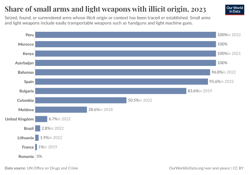 “Data Page: Share of small arms and light weapons with illicit origin”. Our World in Data (2026). Data adapted from UN Office on Drugs and Crime. Retrieved from https://sophia-test-2.owid.pages.dev/grapher/share-of-small-with-illicit-origin [online resource]How to cite this data