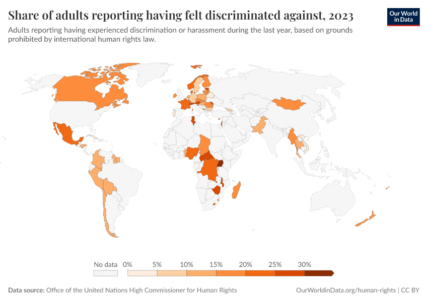 Office of the United Nations High Commissioner for Human Rights – processed by Our World in Data. “Share of adults reporting having felt discriminated against” [dataset]. Office of the United Nations High Commissioner for Human Rights, “Data from multiple sources” [original data]. Retrieved January 6, 2026 from https://sophia-test-2.owid.pages.dev/grapher/share-of-the-population-reporting-having-felt-discriminated-against