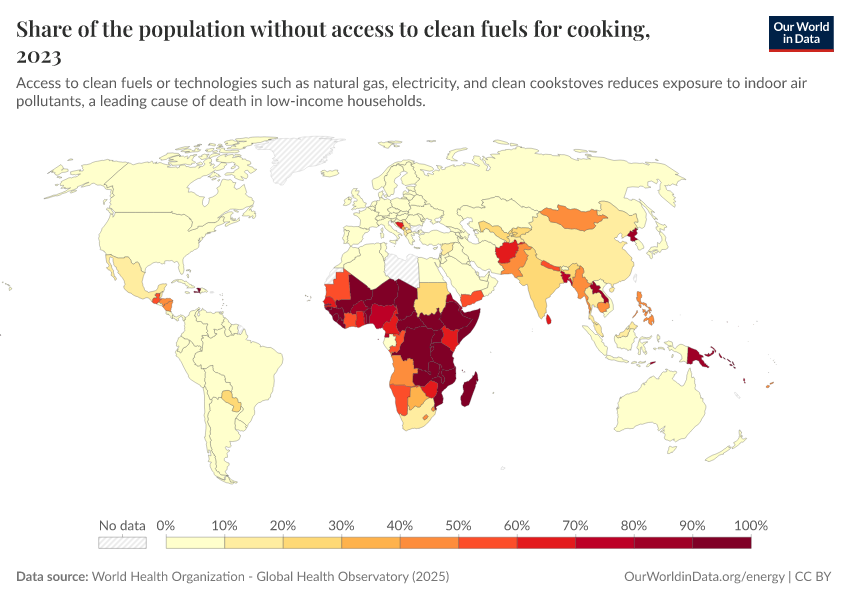 World Health Organization - Global Health Observatory (2025) – processed by Our World in Data. “Share of the population without access to clean fuels for cooking” [dataset]. World Health Organization, “Global Health Observatory” [original data]. Retrieved January 6, 2026 from https://sophia-test-2.owid.pages.dev/grapher/share-of-the-population-without-access-to-clean-fuels-for-cooking