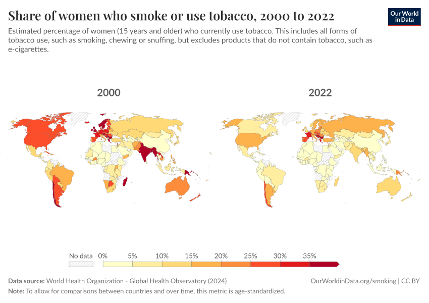 “Data Page: Share of women who smoke or use tobacco”, part of the following publication: Hannah Ritchie and Max Roser (2023) - “Smoking”. Data adapted from World Health Organization. Retrieved from https://sophia-test-2.owid.pages.dev/grapher/share-of-women-who-are-smoking [online resource]How to cite this data