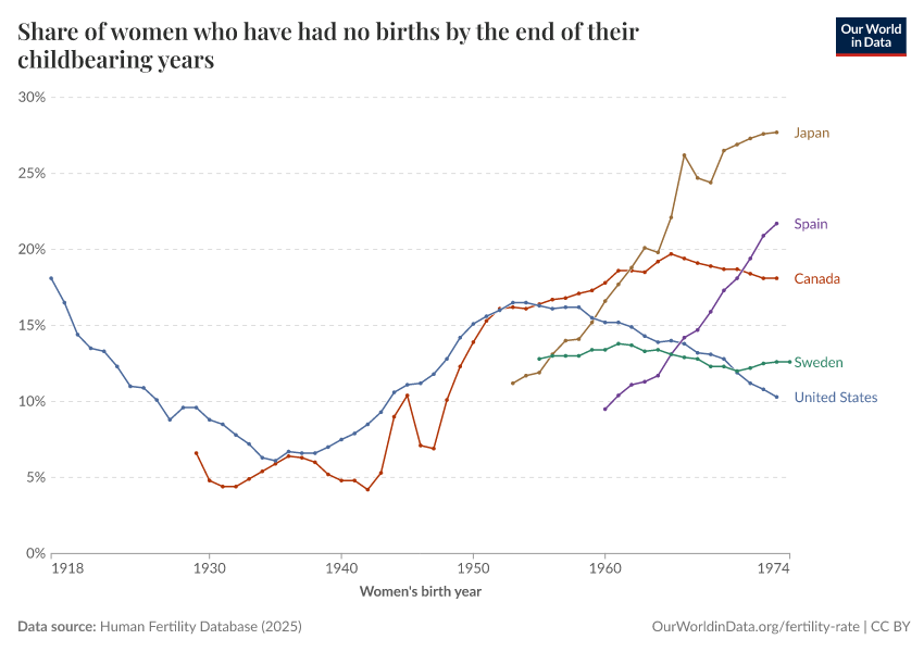 Human Fertility Database (2025) – processed by Our World in Data. “Share of women who have had no births by the end of their childbearing years – HFD” [dataset]. Human Fertility Database, “Human Fertility Database” [original data]. Retrieved January 6, 2026 from https://sophia-test-2.owid.pages.dev/grapher/share-of-women-who-have-had-no-births-across-their-childbearing-years