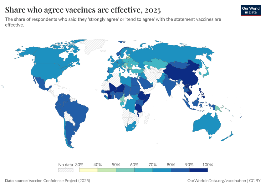 Vaccine Confidence Project (2025) – processed by Our World in Data. “Share who agree vaccines are effective” [dataset]. Vaccine Confidence Project, “Vaccine Confidence Index” [original data]. Retrieved January 6, 2026 from https://sophia-test-2.owid.pages.dev/grapher/share-who-agree-vaccines-are-effective