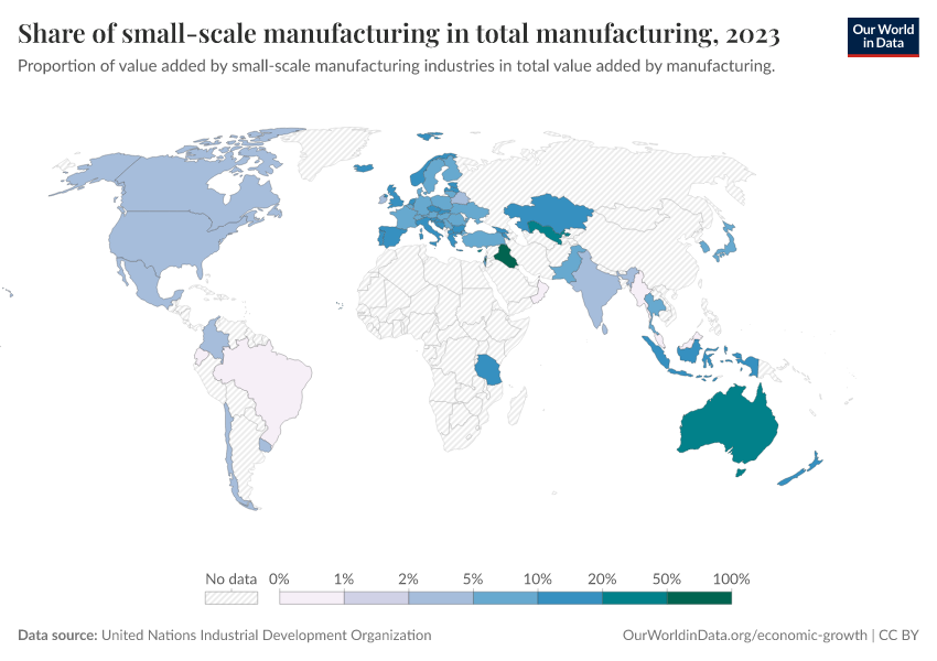 “Data Page: Share of small-scale manufacturing in total manufacturing”. Our World in Data (2026). Data adapted from United Nations Industrial Development Organization. Retrieved from https://sophia-test-2.owid.pages.dev/grapher/small-scale-industries-share [online resource]How to cite this data