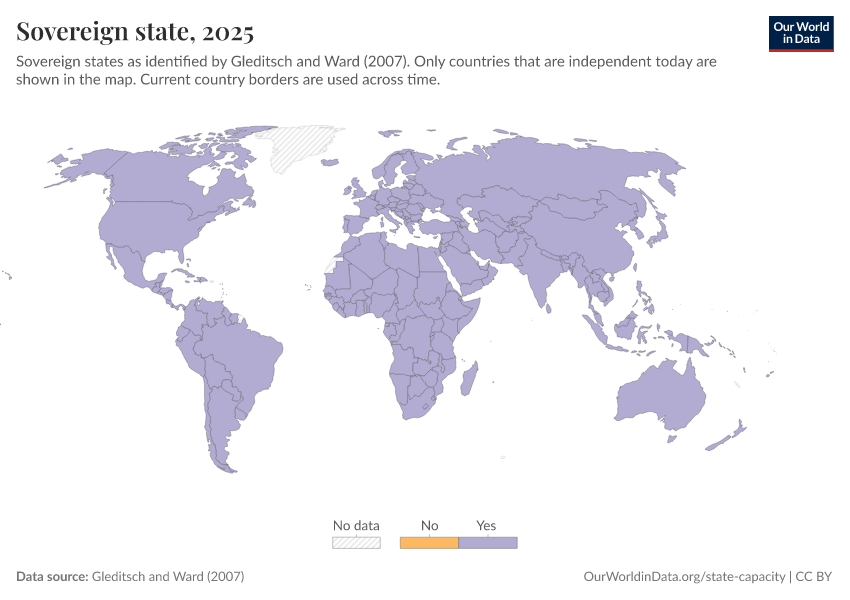 “Data Page: Sovereign state”, part of the following publication: Bastian Herre and Pablo Arriagada (2023) - “State Capacity”. Data adapted from Gleditsch and Ward. Retrieved from https://sophia-test-2.owid.pages.dev/grapher/sovereign-state-gleditsch-ward [online resource]How to cite this data