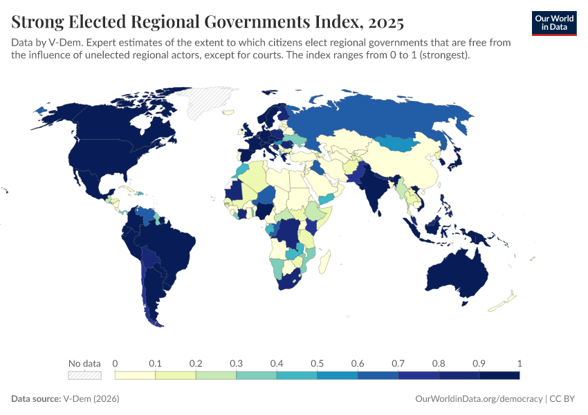 “Data Page: Elected regional governments”, part of the following publication: Bastian Herre, Lucas Rodés-Guirao, and Esteban Ortiz-Ospina (2013) - “Democracy”. Data adapted from V-Dem. Retrieved from https://sophia-test-2.owid.pages.dev/grapher/strong-elected-regional-governments-index [online resource]How to cite this data