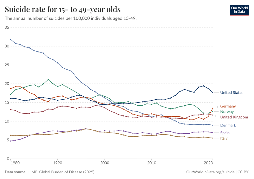“Data Page: Suicide rate for 15- to 49-year olds”, part of the following publication: Esteban Ortiz-Ospina and Max Roser (2016) - “Global Health”. Data adapted from IHME, Global Burden of Disease. Retrieved from https://sophia-test-2.owid.pages.dev/grapher/suicide-rate-for-15--to-49-year-olds [online resource]How to cite this data