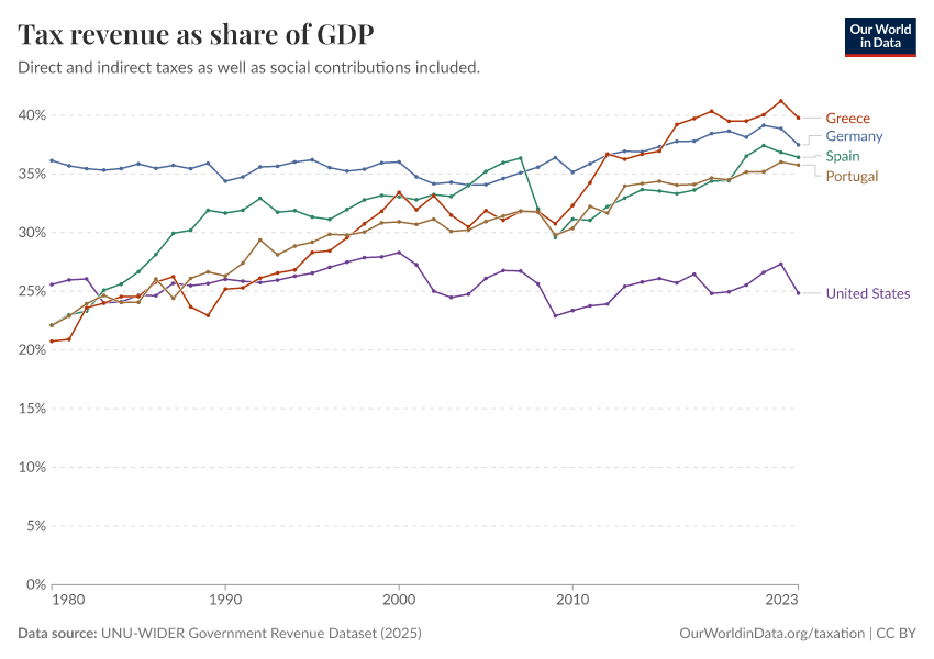 UNU-WIDER Government Revenue Dataset (2023) – with major processing by Our World in Data. “Tax revenues as a share of GDP – UNU-WIDER” [dataset]. UNU-WIDER, “Government Revenue Dataset (GRD) 2023” [original data]. Retrieved January 6, 2026 from https://sophia-test-2.owid.pages.dev/grapher/tax-revenues-as-a-share-of-gdp-unu-wider