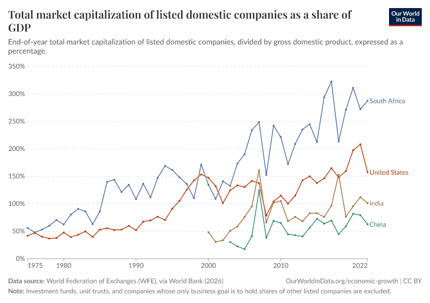 “Data Page: Total market capitalization of listed domestic companies as a share of GDP”. Our World in Data (2026). Data adapted from World Federation of Exchanges (WFE), via World Bank. Retrieved from https://sophia-test-2.owid.pages.dev/grapher/total-market-capitalization-listed-domestic-companies-share-gdp [online resource]How to cite this data