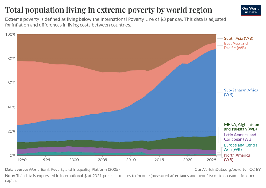 World Bank Poverty and Inequality Platform (2025) – with major processing by Our World in Data. “Total population living in extreme poverty by world region – World Bank” [dataset]. World Bank Poverty and Inequality Platform, “World Bank Poverty and Inequality Platform (PIP) 20250930_2021, 20250930_2017” [original data]. Retrieved January 6, 2026 from https://sophia-test-2.owid.pages.dev/grapher/total-population-living-in-extreme-poverty-by-world-region