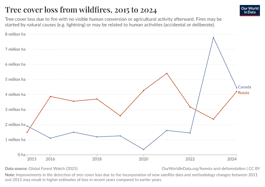 Global Forest Watch (2025) – with major processing by Our World in Data. “Tree cover loss from wildfires” [dataset]. Global Forest Watch, “Tree Cover Loss by Dominant Driver” [original data]. Retrieved January 6, 2026 from https://sophia-test-2.owid.pages.dev/grapher/tree-cover-loss-from-wildfires