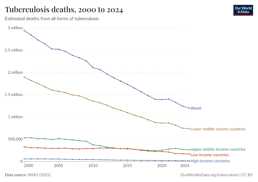 WHO (2024) – with minor processing by Our World in Data. “Tuberculosis deaths” [dataset]. WHO, “Global Tuberculosis Report - Burden Estimates” [original data]. Retrieved January 6, 2026 from https://sophia-test-2.owid.pages.dev/grapher/tuberculosis-deaths-who