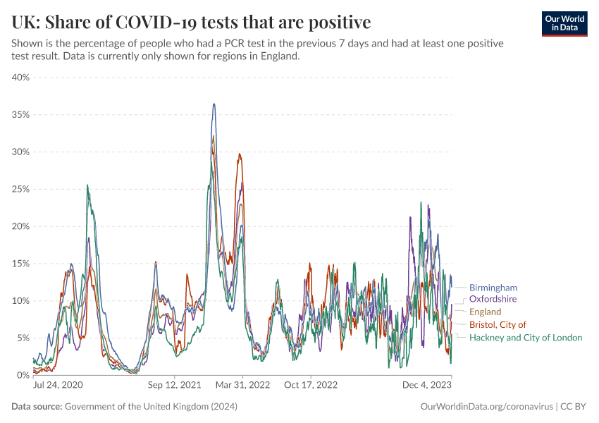 Government of the United Kingdom (2024) – with minor processing by Our World in Data. “UK: Share of COVID-19 tests that are positive” [dataset]. Government of the United Kingdom, “UKHSA data dashboard” [original data]. Retrieved January 6, 2026 from https://sophia-test-2.owid.pages.dev/grapher/uk-covid-positivity