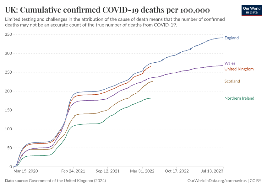 Government of the United Kingdom (2024) – with minor processing by Our World in Data. “UK: Cumulative confirmed COVID-19 deaths per 100,000” [dataset]. Government of the United Kingdom, “UKHSA data dashboard” [original data]. Retrieved January 6, 2026 from https://sophia-test-2.owid.pages.dev/grapher/uk-cumulative-covid-deaths-rate