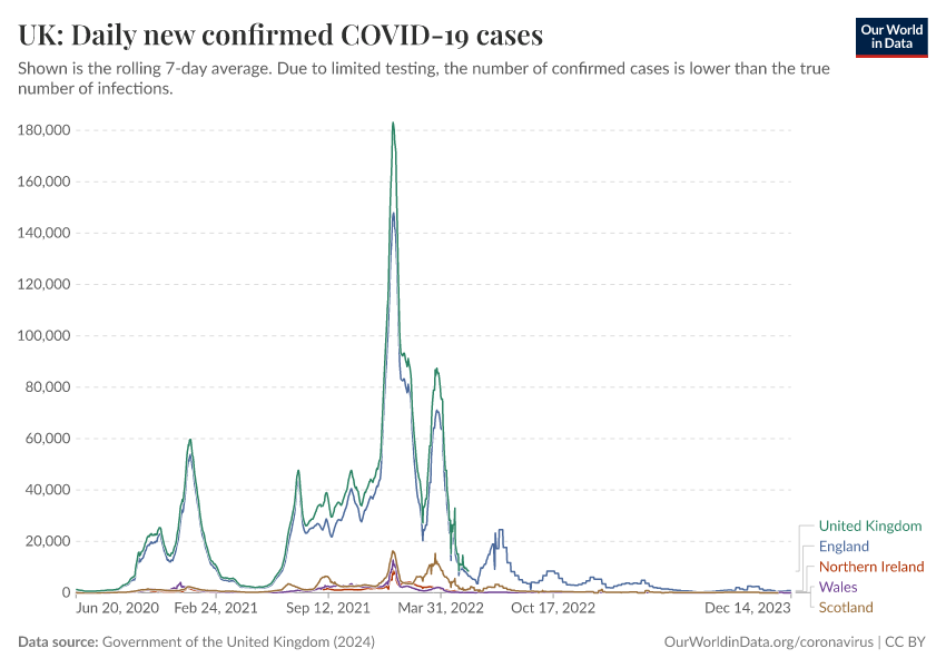 Government of the United Kingdom (2024) – with minor processing by Our World in Data. “UK: Daily new confirmed COVID-19 cases” [dataset]. Government of the United Kingdom, “UKHSA data dashboard” [original data]. Retrieved January 6, 2026 from https://sophia-test-2.owid.pages.dev/grapher/uk-daily-new-covid-cases