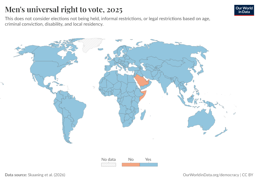 Skaaning et al. (2025) – processed by Our World in Data. “Men's universal right to vote” [dataset]. Skaaning et al., “Lexical Index of Electoral Democracy (LIED) v6.8” [original data]. Retrieved January 6, 2026 from https://sophia-test-2.owid.pages.dev/grapher/universal-suffrage-men-lexical