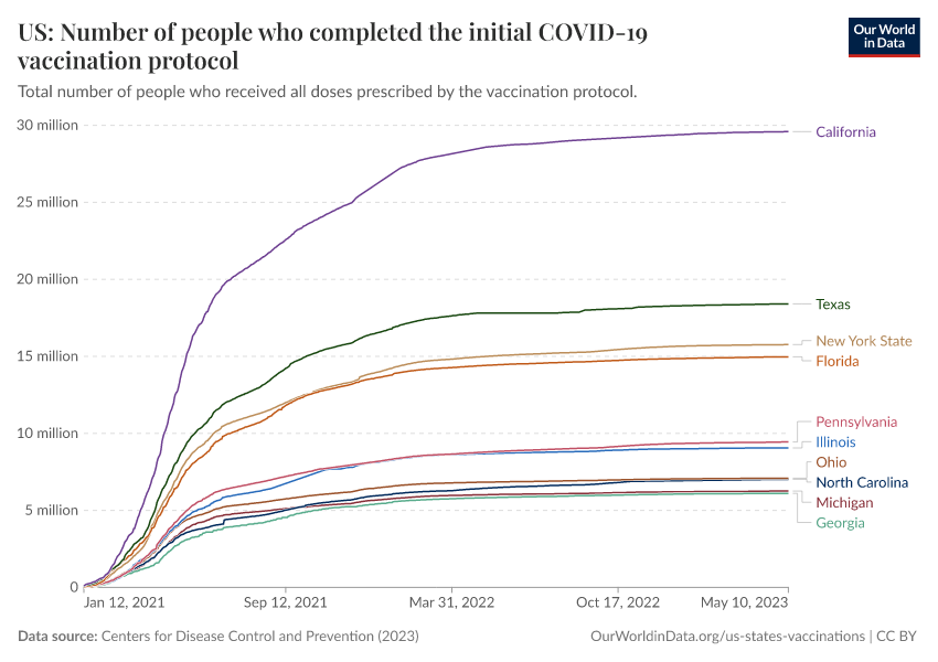 Centers for Disease Control and Prevention (2023) – processed by Our World in Data. “US: Number of people who completed the initial COVID-19 vaccination protocol” [dataset]. Centers for Disease Control and Prevention, “COVID-19, Vaccinations (United States)” [original data]. Retrieved January 6, 2026 from https://sophia-test-2.owid.pages.dev/grapher/us-covid-number-fully-vaccinated