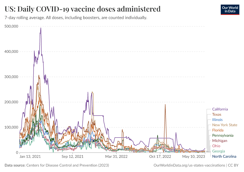 Centers for Disease Control and Prevention (2023) – processed by Our World in Data. “US: Daily COVID-19 vaccine doses administered” [dataset]. Centers for Disease Control and Prevention, “COVID-19, Vaccinations (United States)” [original data]. Retrieved January 6, 2026 from https://sophia-test-2.owid.pages.dev/grapher/us-daily-covid-vaccine-doses-administered