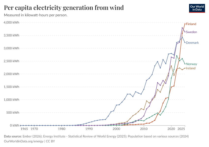 Ember (2025); Energy Institute - Statistical Review of World Energy (2025); Population based on various sources (2024) – with major processing by Our World in Data. “Electricity generation from wind power per person” [dataset]. Ember, “Yearly Electricity Data Europe”; Ember, “Yearly Electricity Data”; Energy Institute, “Statistical Review of World Energy”; Various sources, “Population” [original data]. Retrieved January 6, 2026 from https://sophia-test-2.owid.pages.dev/grapher/wind-electricity-per-capita