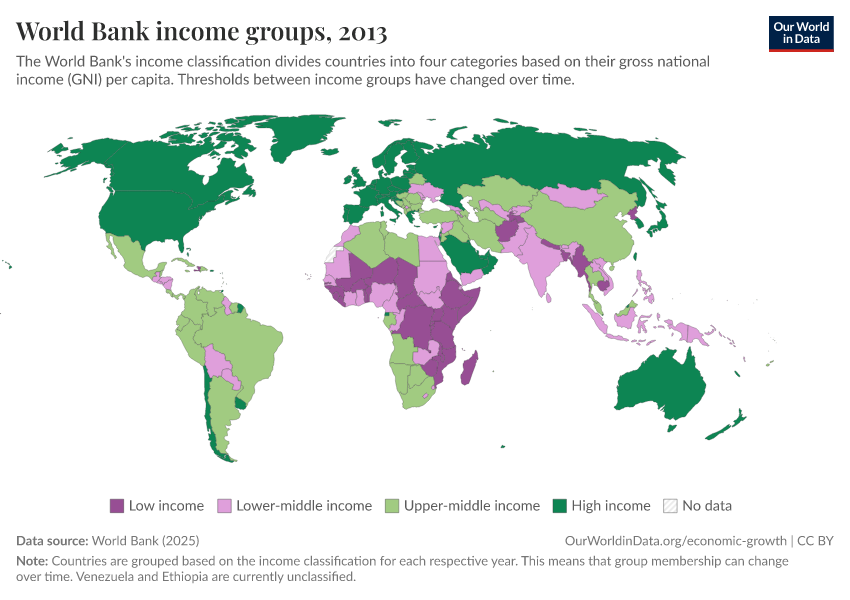 “Data Page: World Bank income groups”, part of the following publication: Max Roser, Bertha Rohenkohl, Pablo Arriagada, Joe Hasell, Hannah Ritchie, and Esteban Ortiz-Ospina (2023) - “Economic Growth”. Data adapted from World Bank. Retrieved from https://sophia-test-2.owid.pages.dev/grapher/world-bank-income-groups [online resource]