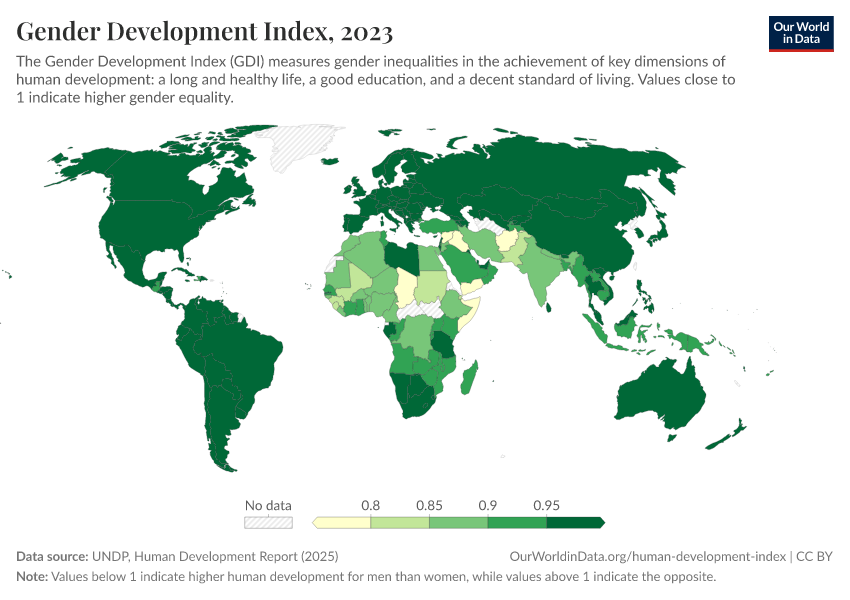 The GDI is the ratio of the female HDI to the male HDI. Values below 1 indicate higher human development for men than women, while values above 1 indicate the opposite. Values closer to 1 therefore indicate higher gender equality.