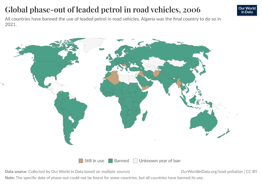 Hannah Ritchie (2022) - “How the world eliminated lead from gasoline” Published online at OurWorldinData.org. Retrieved from: 'https://sophia-test-2.owid.pages.dev/leaded-gasoline-phase-out' [Online Resource]BibTeX citation