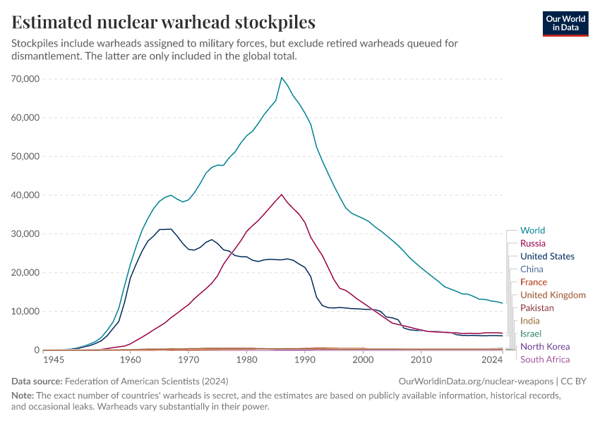 Since then we have seen a reversal of this trend, as the chart shows. The nuclear powers reduced their arsenals a lot in the following decades, and the number of warheads fell below 20,000 in the 2010s.