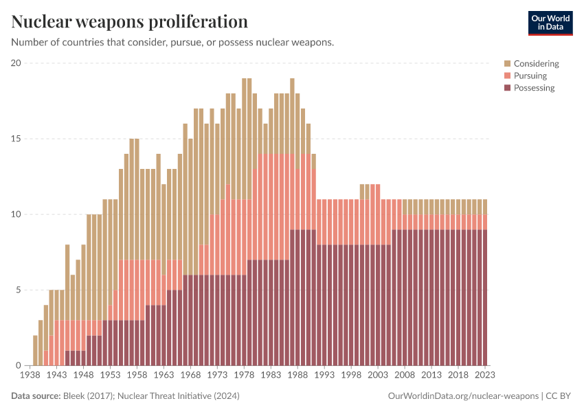 On this page, you can find writing, visualizations, and data on how many states have nuclear weapons, how many warheads they possess, how many oppose them, and how this has changed over time.