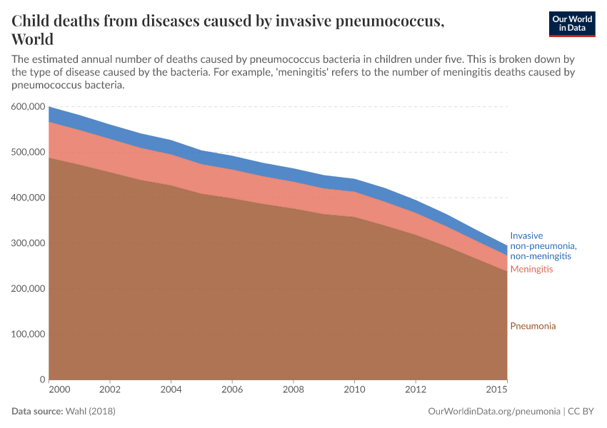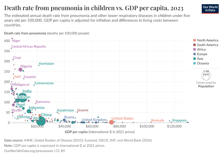 On this topic page, we look at who is suffering from pneumonia and why — and what can we do to reduce the number of people dying from this disease, with interventions such as vaccination, oxygen therapy, reducing air pollution, and more.