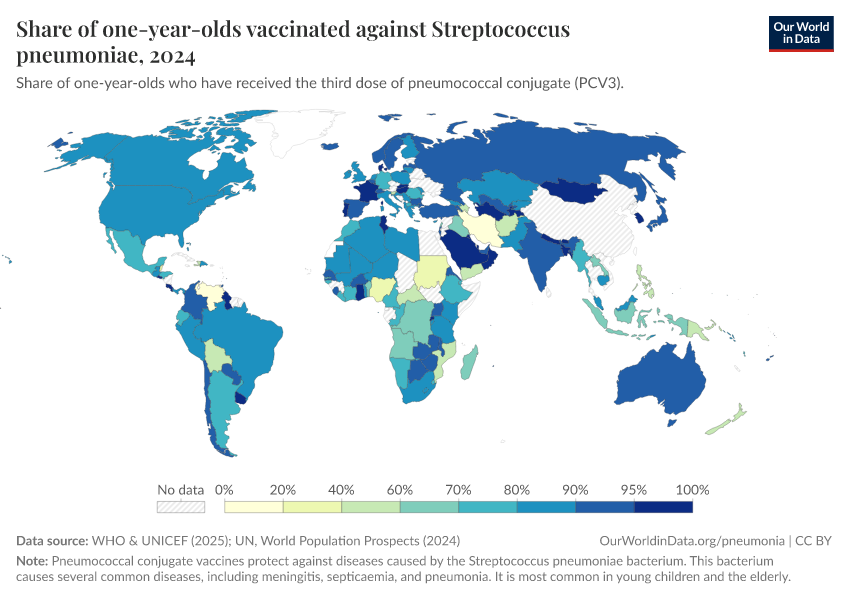 In 2021, around half of one-year-olds worldwide received the third dose of pneumococcal vaccines.