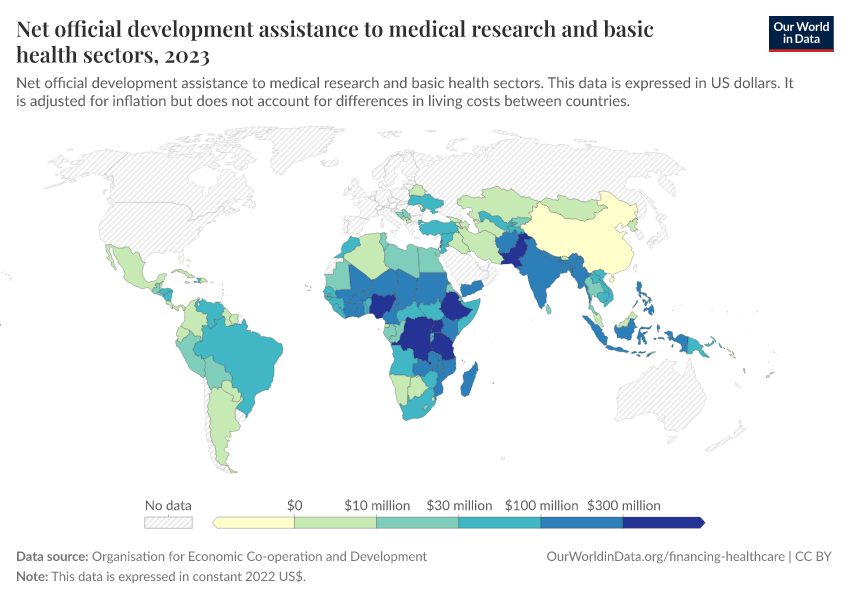 This indicator is measured as disbursements of official development assistance (ODA) and other official flows to the medical research and basic health sectors.