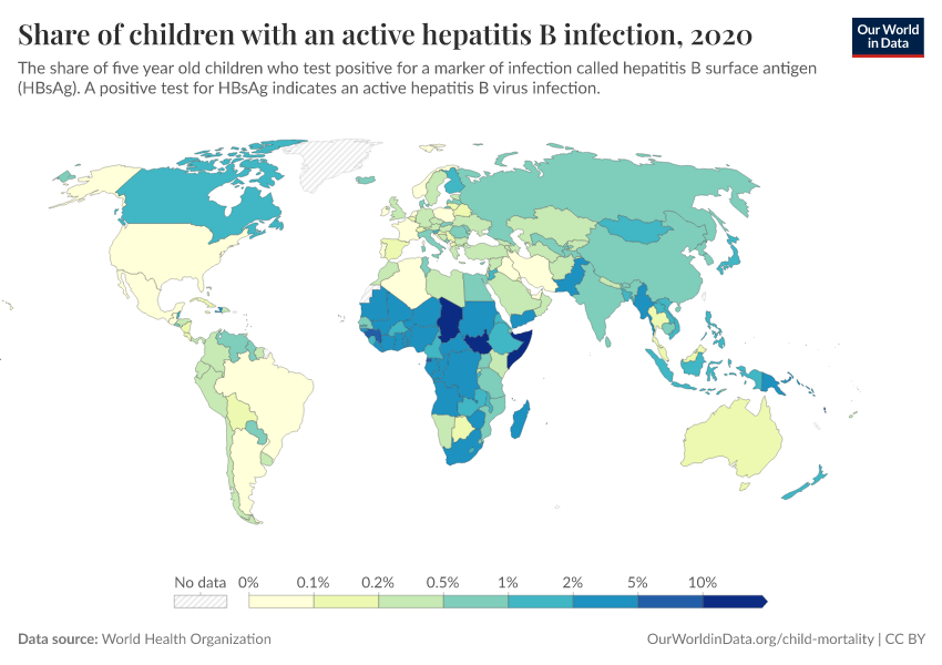 Hepatitis B incidence is the number of new cases of hepatitis B in one year per 100,000 people in a given population. This is measured indirectly as the share of children under 5 years of age with an active Hepatitis B infection, as measured by an Hepatitis B surface antigen test.