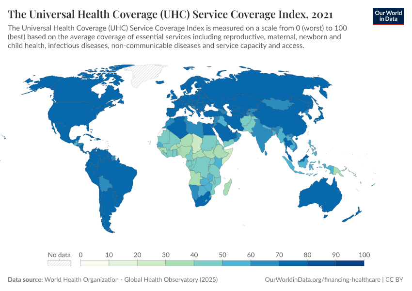 The Universal Health Coverage (UHC) Service Coverage Index is used to track progress on this indicator. The index is on a scale from 0 to 100, where 100 is the optimal value, and calculated from the geometric mean of 14 indicators measuring the coverage of essential services including reproductive, maternal, newborn and child health, infectious diseases, non-communicable diseases and service capacity and access.