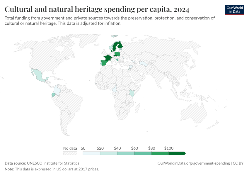 Data for this indicator is shown in the interactive visualization. It is given as per capita expenditure – from public and private sources – on cultural and natural heritage preservation, protection, and conservation. This data is reported in constant dollars, which adjusts for inflation.