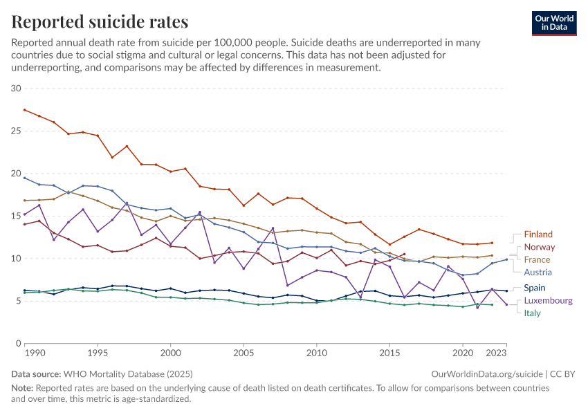 Saloni Dattani, Lucas Rodés-Guirao, Hannah Ritchie, Max Roser, and Esteban Ortiz-Ospina (2023) - “Suicides” Published online at OurWorldinData.org. Retrieved from: 'https://sophia-test-2.owid.pages.dev/suicide' [Online Resource]BibTeX citation