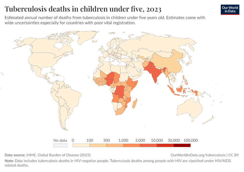 Typically, in international statistics, “tuberculosis deaths” refers to deaths in HIV-negative people, while tuberculosis deaths among people with HIV are classified under “HIV/AIDS related deaths”.