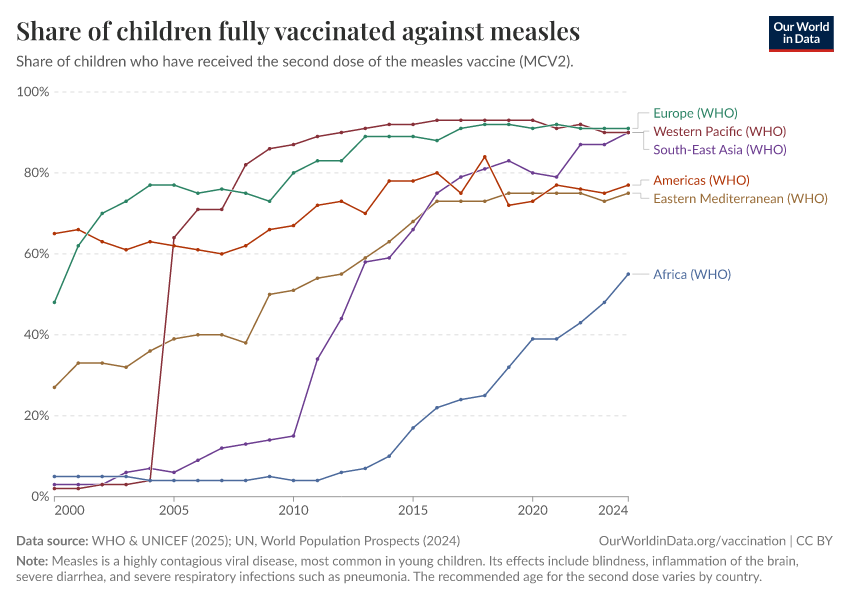 As the next chart shows, global vaccination against measles has increased from less than 20% in 2000 to over 70% today. Remember from earlier that vaccination against measles has saved the most lives.