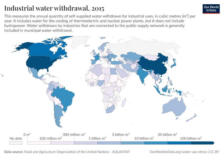 The visualization provides an overview of industrial water withdrawals measured as the share of total water withdrawals (which is the sum of agricultural, industrial, and domestic uses).